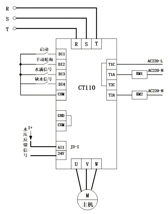 供水系統(tǒng)在供水官網(wǎng)上安裝壓力傳感器,將水壓信號(hào)轉(zhuǎn)換成變頻器可接受的4~20mA電流型信號(hào)。系統(tǒng)工作時(shí),壓力傳感器實(shí)時(shí)檢測(cè)水壓,變頻器接收壓力信號(hào),實(shí)際壓力信號(hào)與給定壓力信號(hào)的有差調(diào)節(jié)構(gòu)成壓力閉環(huán)系統(tǒng)。變頻器通過(guò)PID輸出改變頻率來(lái)改變水泵電機(jī)的轉(zhuǎn)速。但是變頻泵運(yùn)行轉(zhuǎn)速的上下限限制了單臺(tái)泵無(wú)法應(yīng)對(duì)用水量高峰和低峰期。我們開(kāi)發(fā)的恒壓供水專用變頻器CT110結(jié)合以上情況,擴(kuò)展供水專用邏輯,通過(guò)兩路輔助繼電器與啟用臺(tái)數(shù),自動(dòng)調(diào)節(jié)峰谷用水量,保證供水管網(wǎng)壓力恒定,以滿足用戶用水的需求。CT110恒壓供水原理圖如下: