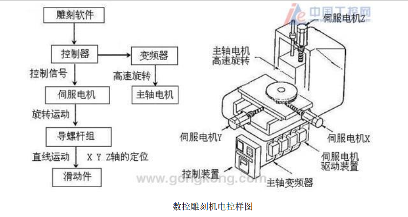 數(shù)控雕刻機電控系統(tǒng)主要由CNC數(shù)控系統(tǒng)、主軸定位系統(tǒng)、主軸旋轉(zhuǎn)系統(tǒng)三部分組成。各部分功能如下: